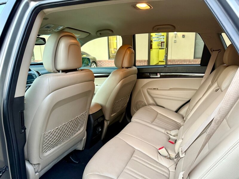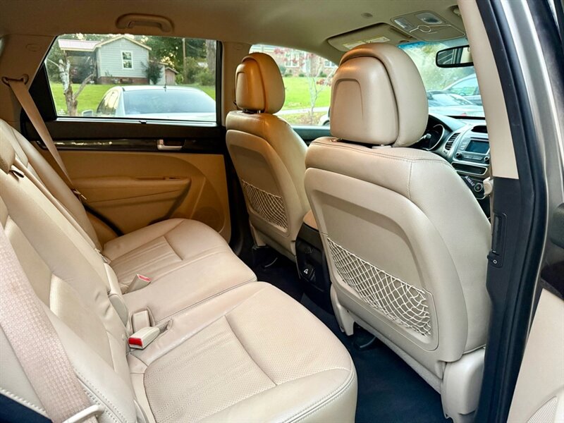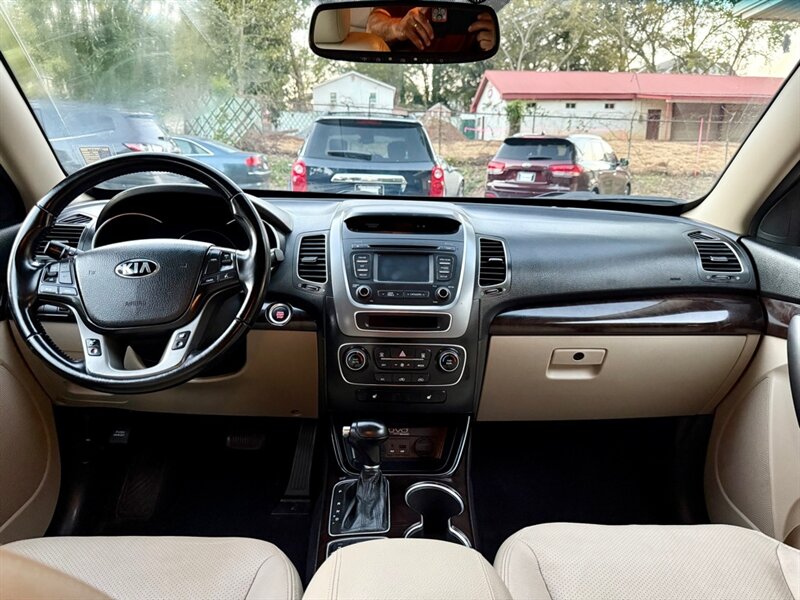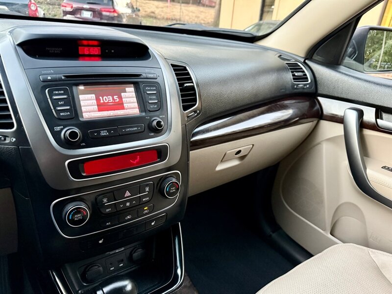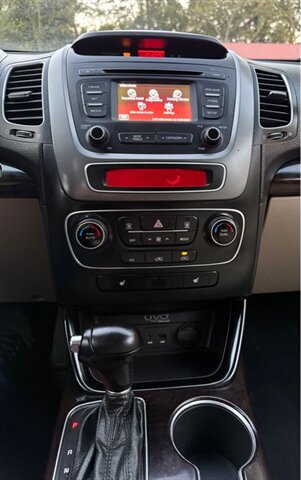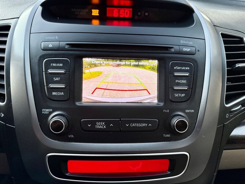 The 2014 Kia Sorento EX offers a blend of performance and comfort with its robust 3.3L V6 engine, delivering 290 horsepower and 252 ft-lbs of torque. This midsize SUV features a sleek Satin Metal exterior complemented by a luxurious Tan leather interior. Standard factory features include a power liftgate, a rearview camera, and a touchscreen infotainment system with Bluetooth connectivity, ensuring convenience and connectivity on the go. Additionally, the Sorento EX is equipped with dual-zone automatic climate control, heated front seats, and a premium audio system for an enhanced driving experience. With an EPA-estimated fuel efficiency of 18 MPG in the city and 25 MPG on the highway, this vehicle is in excellent overall condition, making it a reliable choice for any driver.